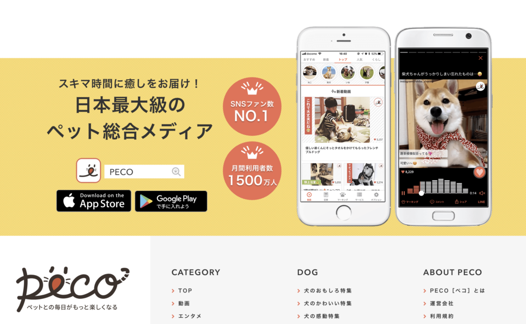 PECO[ペコ]は、国内最大級のペット専門メディアで、月間利用者数は1,500万人に達しています。